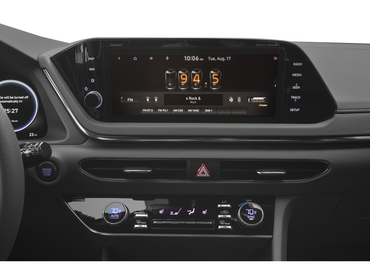 - Radio: AM/FM/MP3/HD/SiriusXM Display Audio w/Nav -inc: 10.25" color touchscreen, Bose premium audio w/12 speakers (1 center channel, 2 dash, 2 front tweeters, 4 door mounted, 2 rear mounted speakers plus 1 rear mounted subwoofer), dynamic voice recognition, integrated Bluetooth®, Blue Link connected car system, Apple CarPlay, Android Auto, USB, diversity antenna for navigation and HERE HD traffic